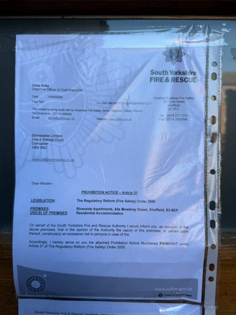 A spokesperson for South Yorkshire Fire and Rescue said: “On Wednesday 15th April 2026, business fire safety inspectors served a Prohibition Notice on Riverside Apartments on Mowbray Street, Sheffield.